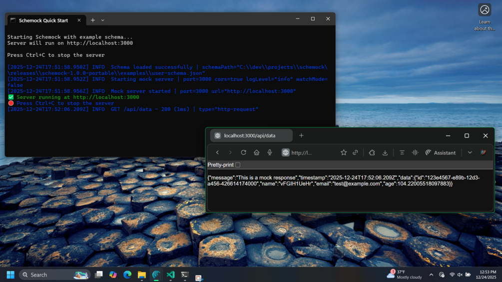 Instant mock APIs in seconds JSON Schema โ Live REST API: Turn any JSON Schema into a working GET/POST endpoint in under 60 seconds, no backend required. โ Zero setup, zero dependencies: Run the portable schemock.exe on Windows without installing Node.js, npm, or any extra tooling. โ Realistic mock data: Auto-generates UUIDs, emails, timestamps, URIs, enums, arrays, and nested objects that match your schema constraints. โ Built for frontend and testing Frontendโready out of the box: CORS enabled, health check endpoint, and 10โ30 ms responses tailored for React, Vue, Angular, and SPA workflows. โ Hot reload for fast iteration: Watch mode automatically reloads your mock server whenever you change a schema file. โ Stable test data: Typeโaware, constraintโaware generation lets you build reliable integration tests and demos without hitting real APIs. โ Developerโfriendly CLI & performance Simple CLI commands: schemock start schema.json, custom ports, watch mode, logging levels, and moreโall documented with copyโpaste examples. โ Lightweight and fast: ~1.5 second startup, 60โ80 MB memory footprint, and support for 200+ concurrent requests. โ Clear errors and docs: Helpful error messages plus Quick Start, User Guide, API docs, Deployment, Troubleshooting, and readyโmade example schemas. โ Productionโgrade quality & security Extensive test coverage: 176/176 tests passing, covering core behavior, performance, and security. โ Securityโconscious by design: Input validation, path traversal protection, request size limits, and dedicated security test suite. โ Readyโtoโship package Portable executable + utilities: schemock.exe, quickโstart batch files, health check endpoint, and version info bundled together. โ Examples included: Simple user API and full eโcommerce product API schemas so you can see real responses immediately. โ Flexible licensing: Use as open source (MIT) or upgrade to commercial binaries and support without any recurring subscription.